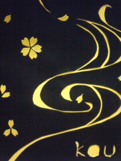 透かし絵は添付ファイルのそれです。黒い折り紙を一枚画のまま切って裏に黄色い台紙を貼ってあります。流水紋頑張った!けど桜の花びらは諦めて貼り絵\(^O^)/